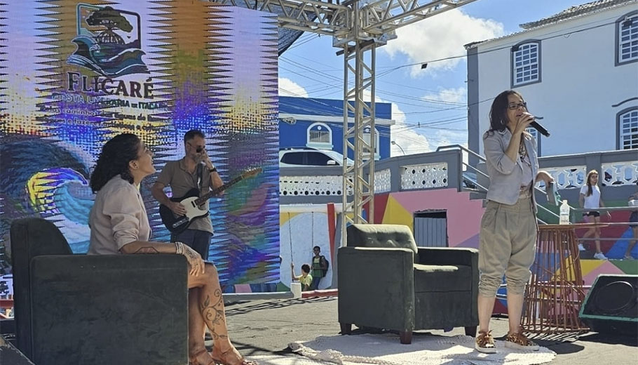 Caroline Borba, Editora chefe da BFK Books e Monique Sé, escritora e Membro do Conselho Editorial da BFK apresentaram o show poético Versos & Acordes, no palco principal da Flicaré – Feira Literária de Itacaré.
